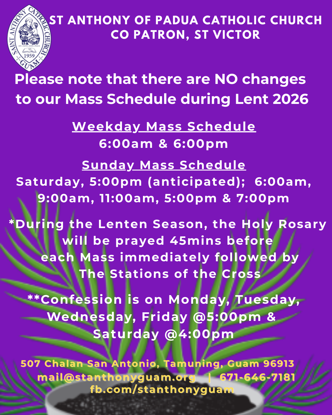 There are NO changes to our daily Mass schedule: 6:00am & 6:00pm or Sunday Mass Schedule: Saturday, 5:00pm (anticipated), Sunday: 6:00am, 9:00am, 11:00am, 5:00pm & 7:00pm.